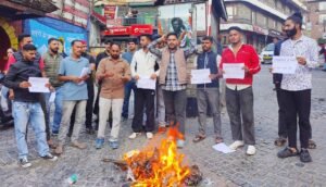 मसूरी:- युवा कांग्रेस व एनएसयूआई ने यूकेएसएसएससी पेपर रदद करने की मांग को लेकर शहीद भगत सिंह चौक पर प्रदेश सरकार व मुख्यमंत्री पुष्कर सिंह धामी का पुतला दहन किया गया।
